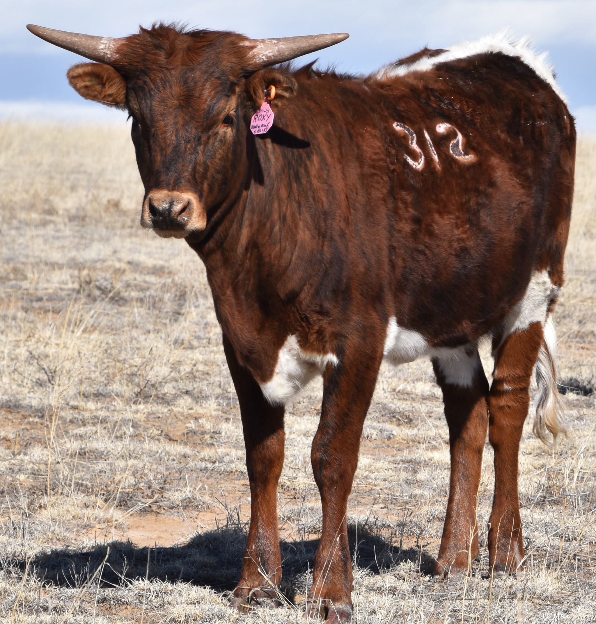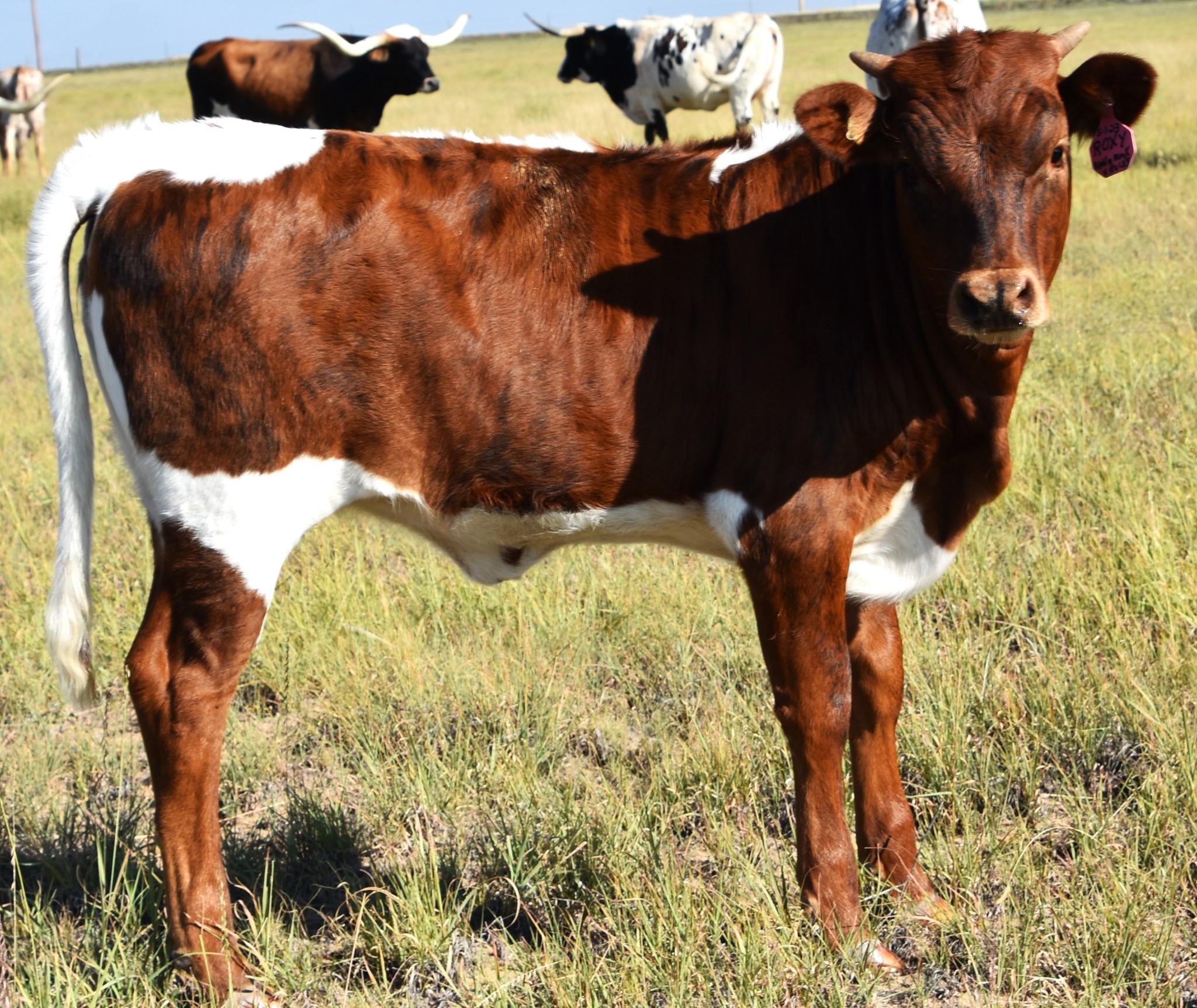 She is a beautiful BRINDLE with lots of chrome. Roxy is well balanced, beefy and has exceptional over 90"ttt ancestors. She may have some curl with her pedigree. She is a beautiful, colorful, well built heifer.
