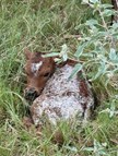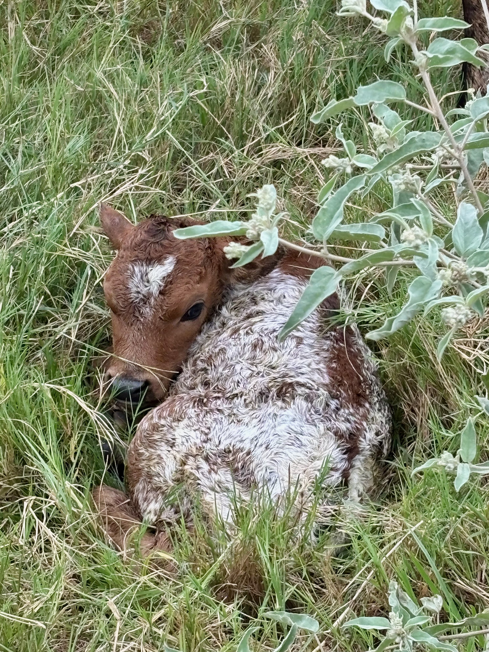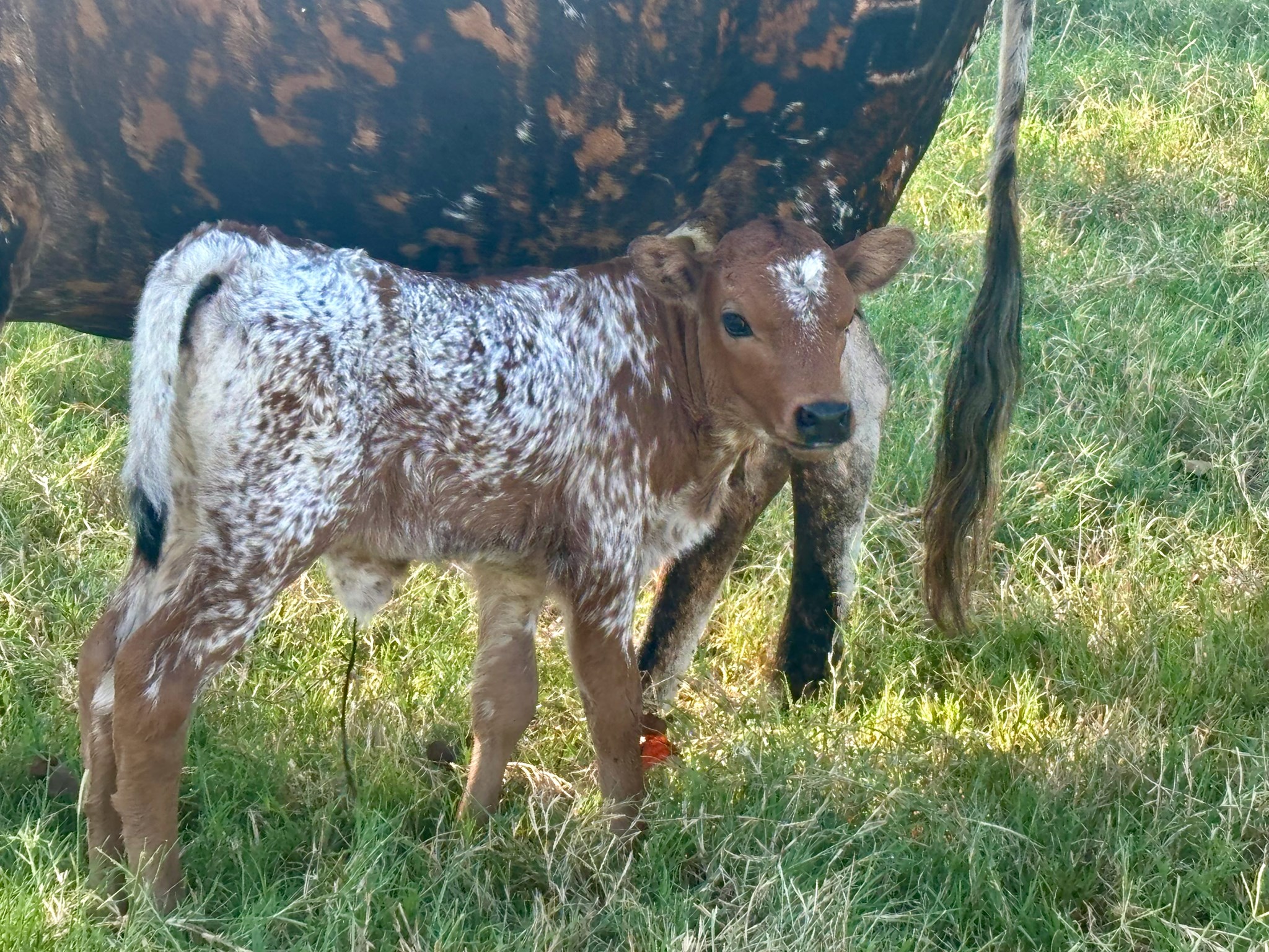 Parker brown with white spots. great early horn development at a month with black horn.
